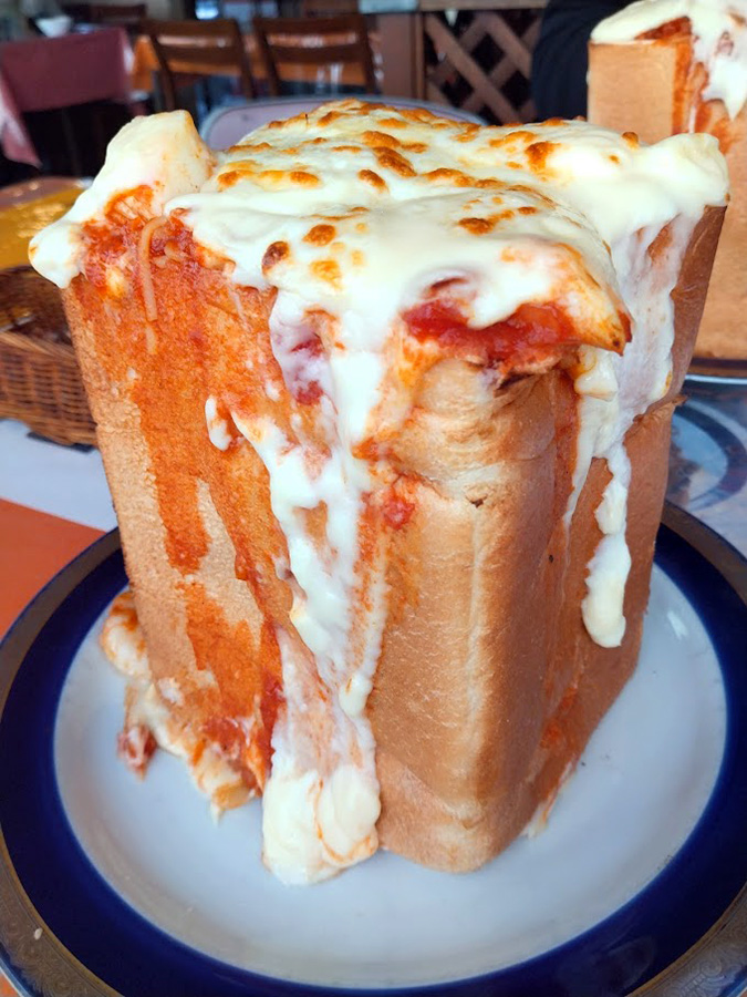 食パンの上に生クリームが乗っかっていてチョコソースが掛かっています。